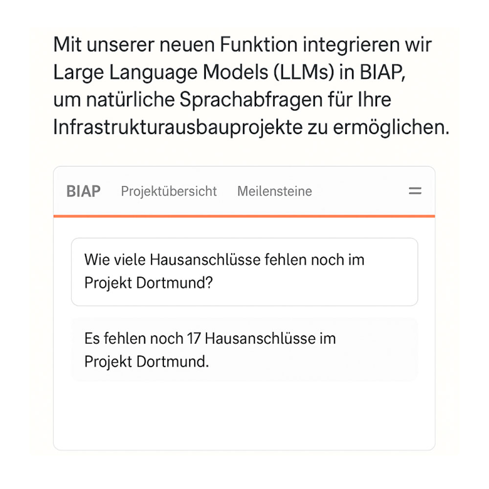 Und bekommst sofort die passende Antwort – ohne Suchen, ohne SQL, direkt aus deinen Projektdaten. Egal ob Trassenmeter, offene Hausanschlüsse oder Baufortschritt – BIAP versteht dich.